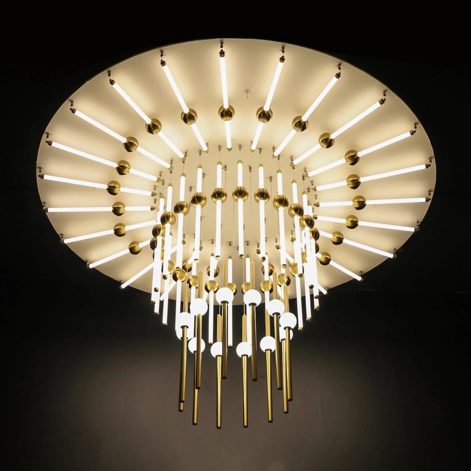 Elegant Cascade: A total of 68 pendants, each measuring 2 feet, are arranged in perfect symmetry, creating a luxurious waterfall of light.