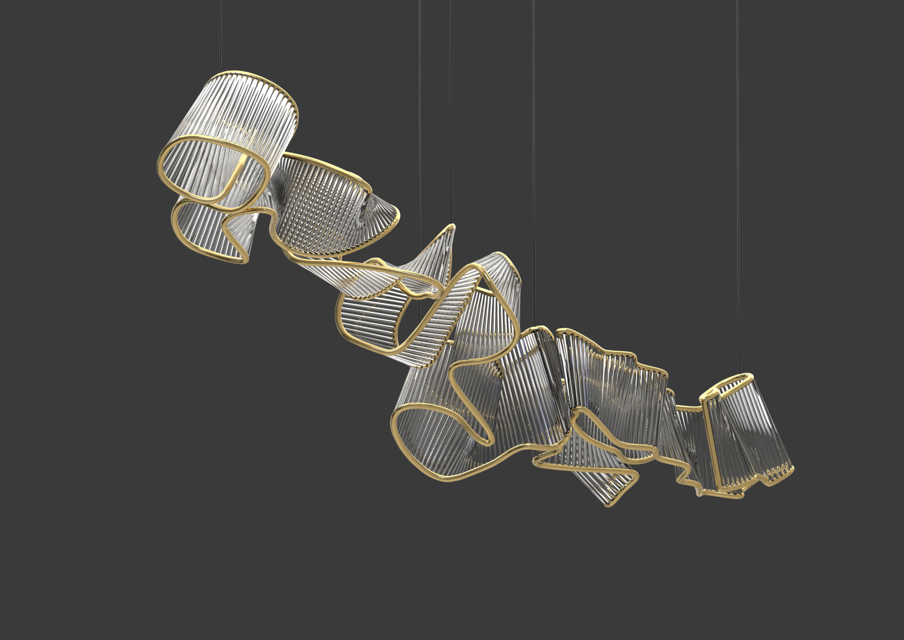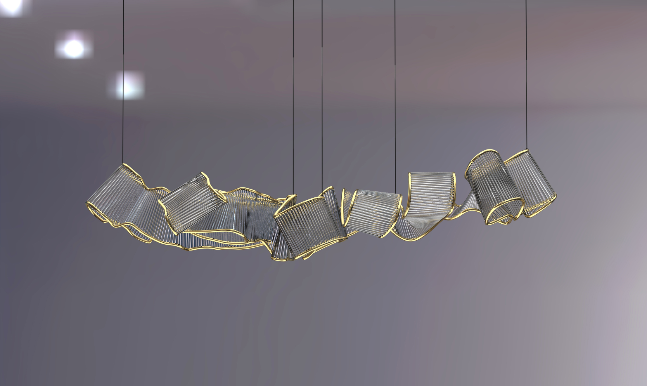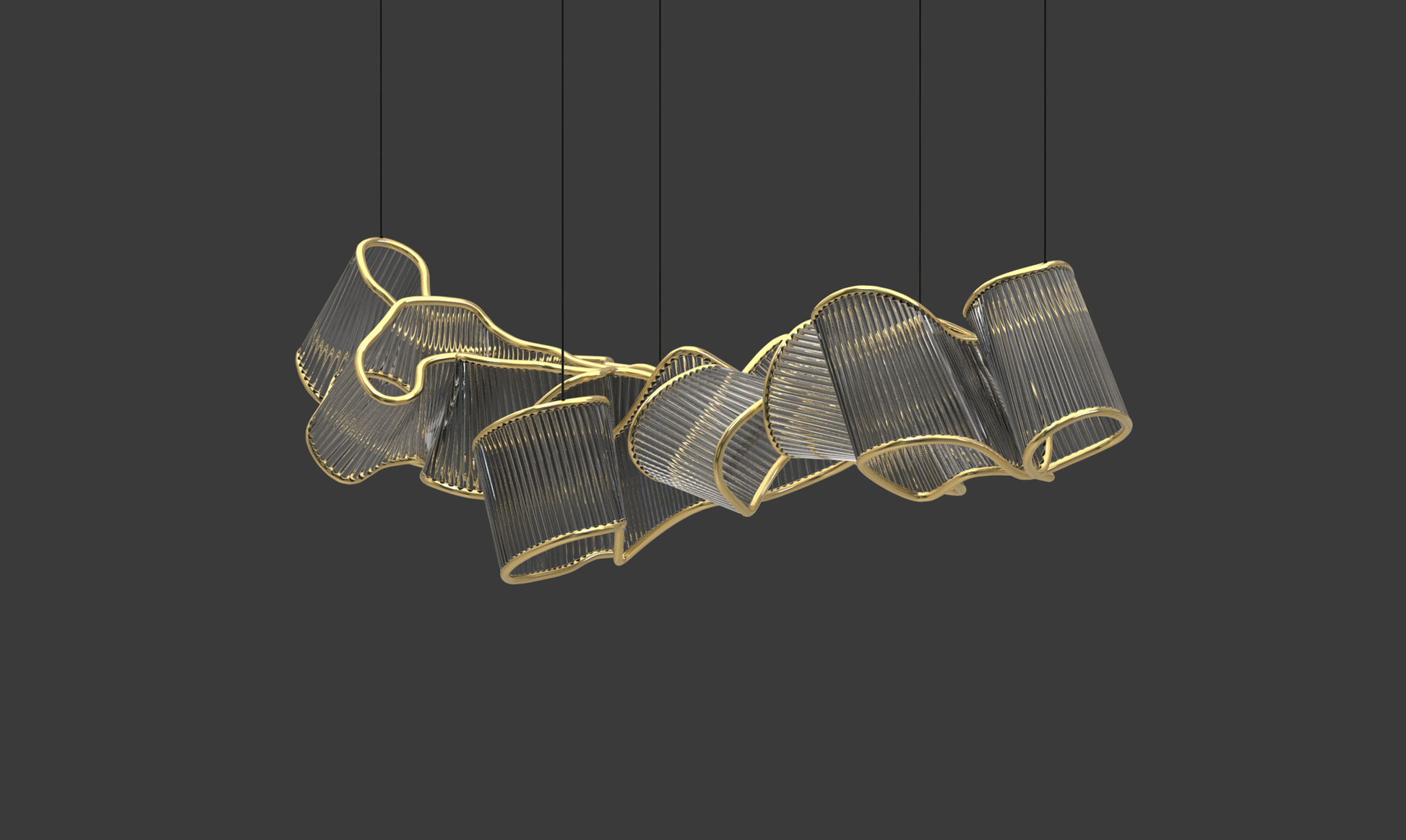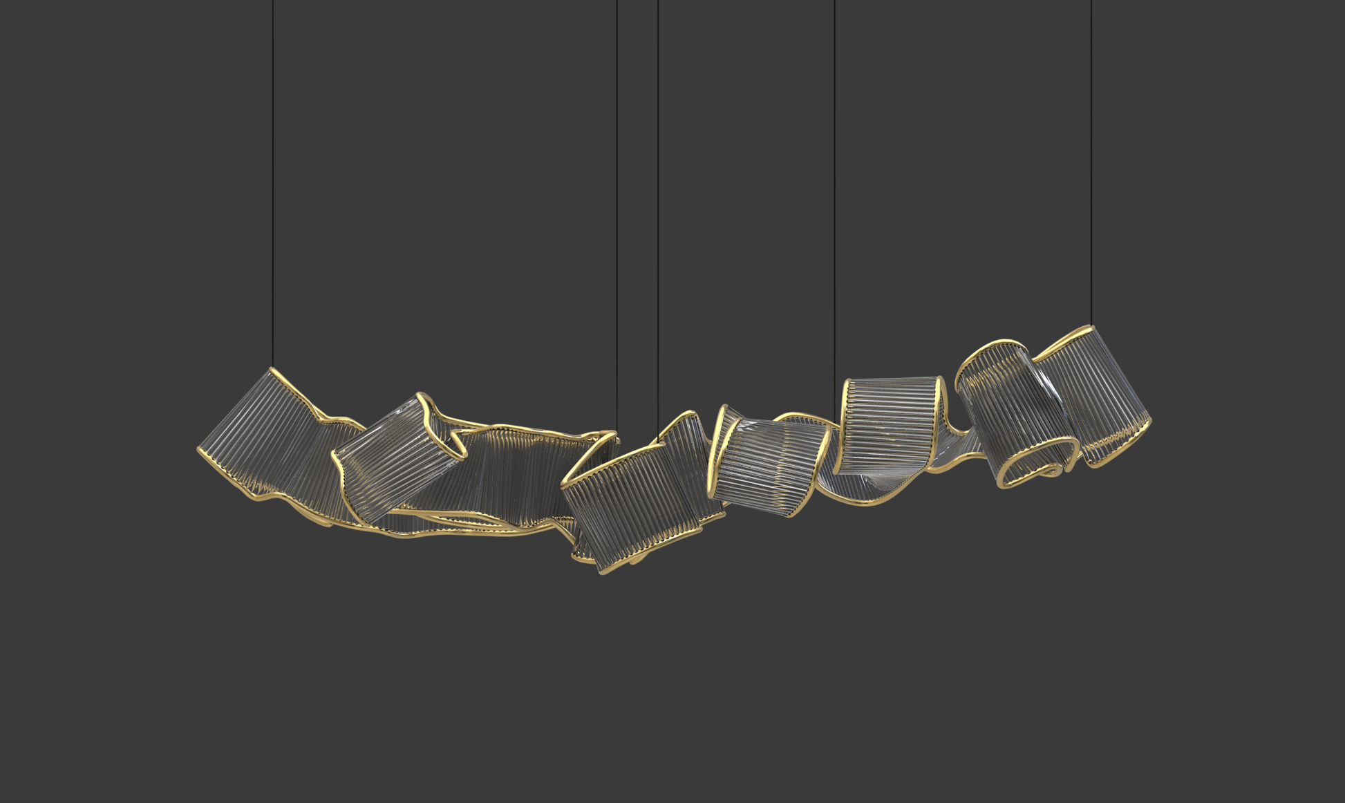 An artistic ribbon-inspired chandelier crafted with hundreds of hand-assembled glass pencils, creating a fluid, sculptural form. This made-to-order chandelier is illuminated by G4/G9 LED lamps that highlight the elegant ribbon shape and bring brilliance to the glass details.