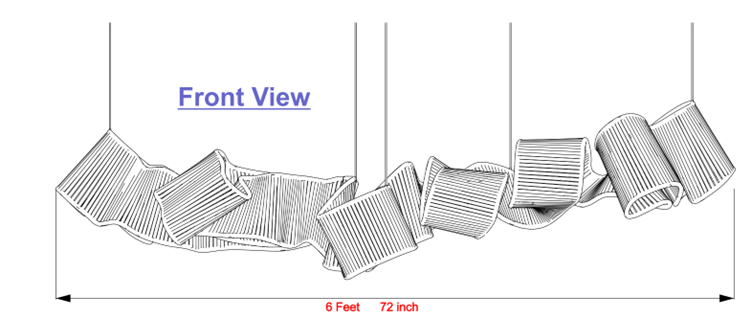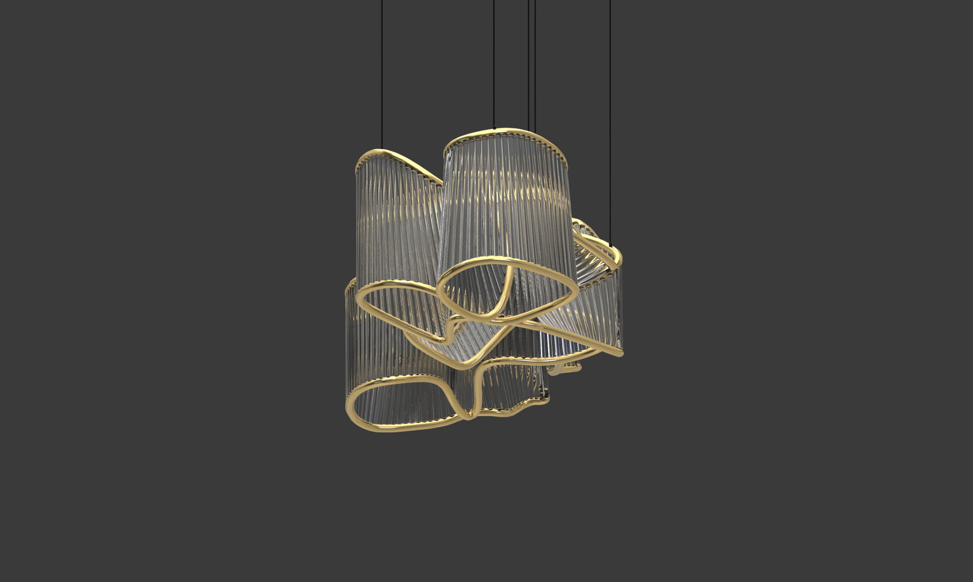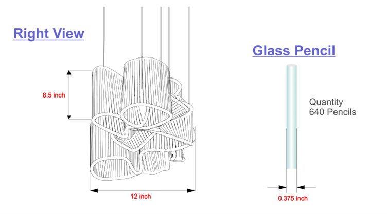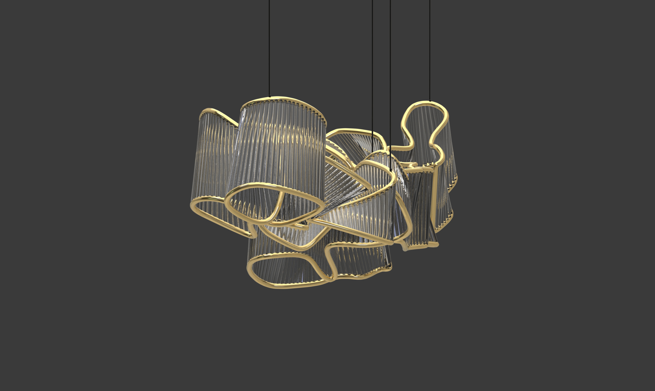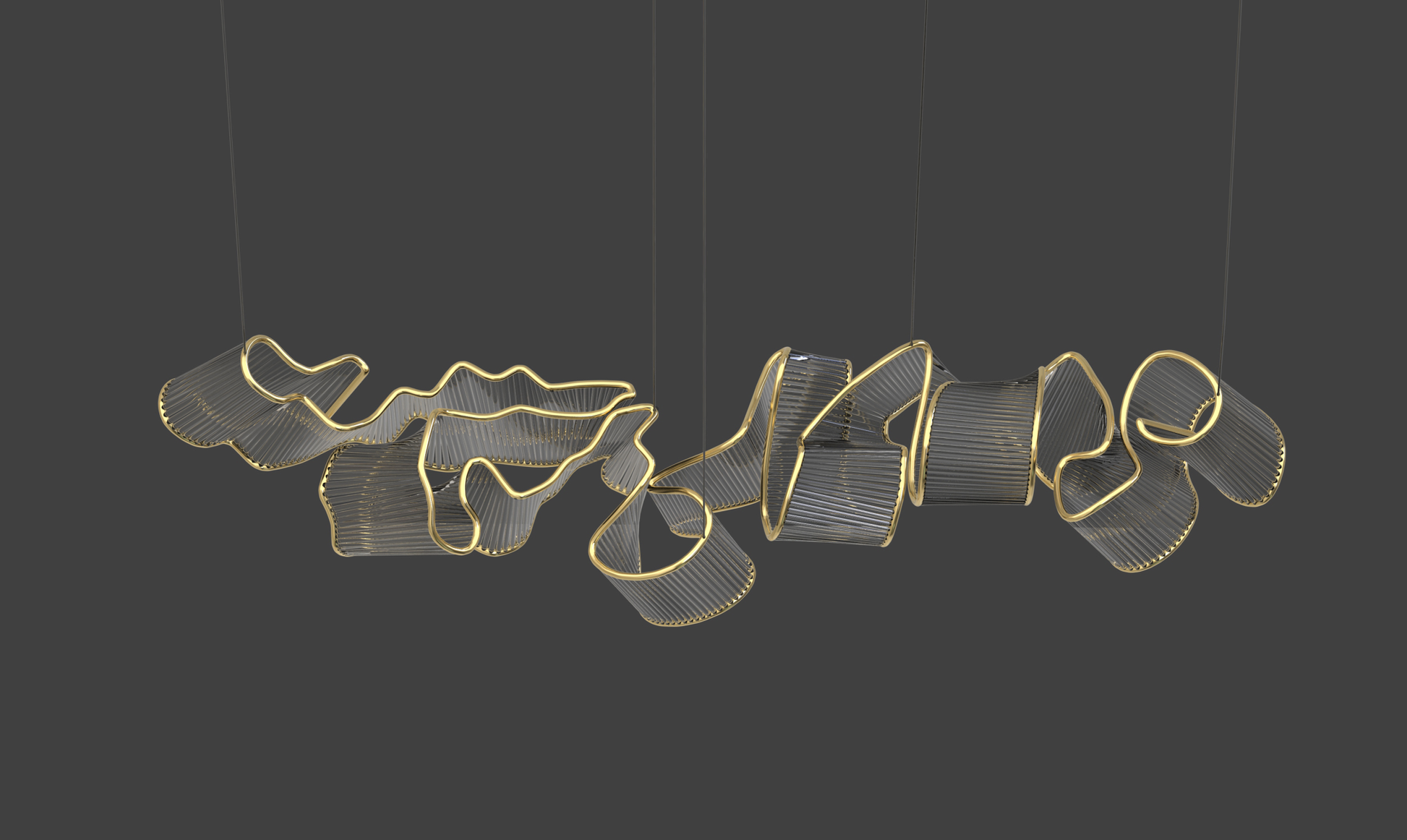 An artistic ribbon-inspired chandelier crafted with hundreds of hand-assembled glass pencils, creating a fluid, sculptural form. This made-to-order chandelier is illuminated by G4/G9 LED lamps that highlight the elegant ribbon shape and bring brilliance to the glass details.