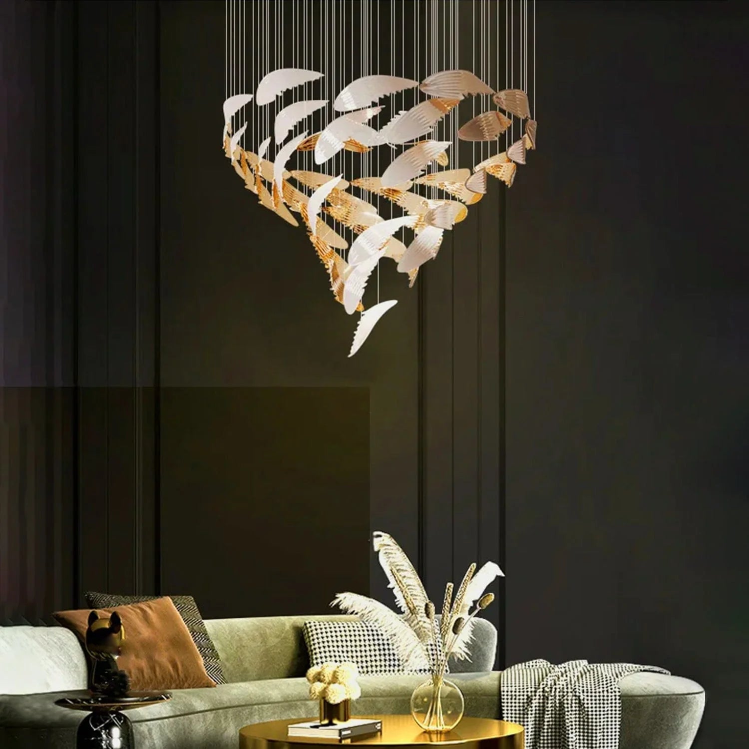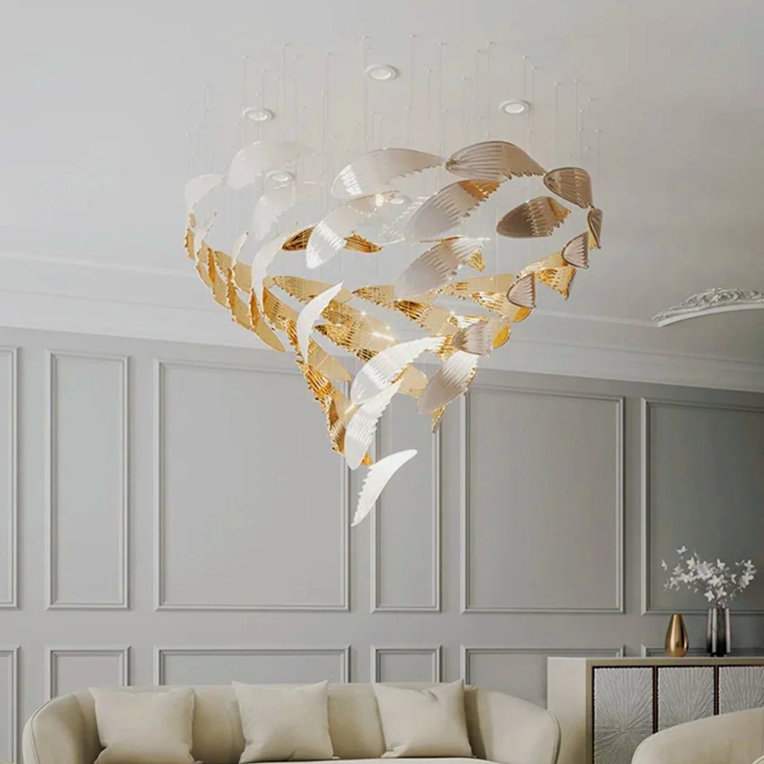 Bring a touch of timeless luxury to your interiors with our Golden Leaf Chandelier. Inspired by the elegance of nature, each delicately crafted leaf-shaped glass element is suspended from fine strings, creating a shimmering cascade of light.