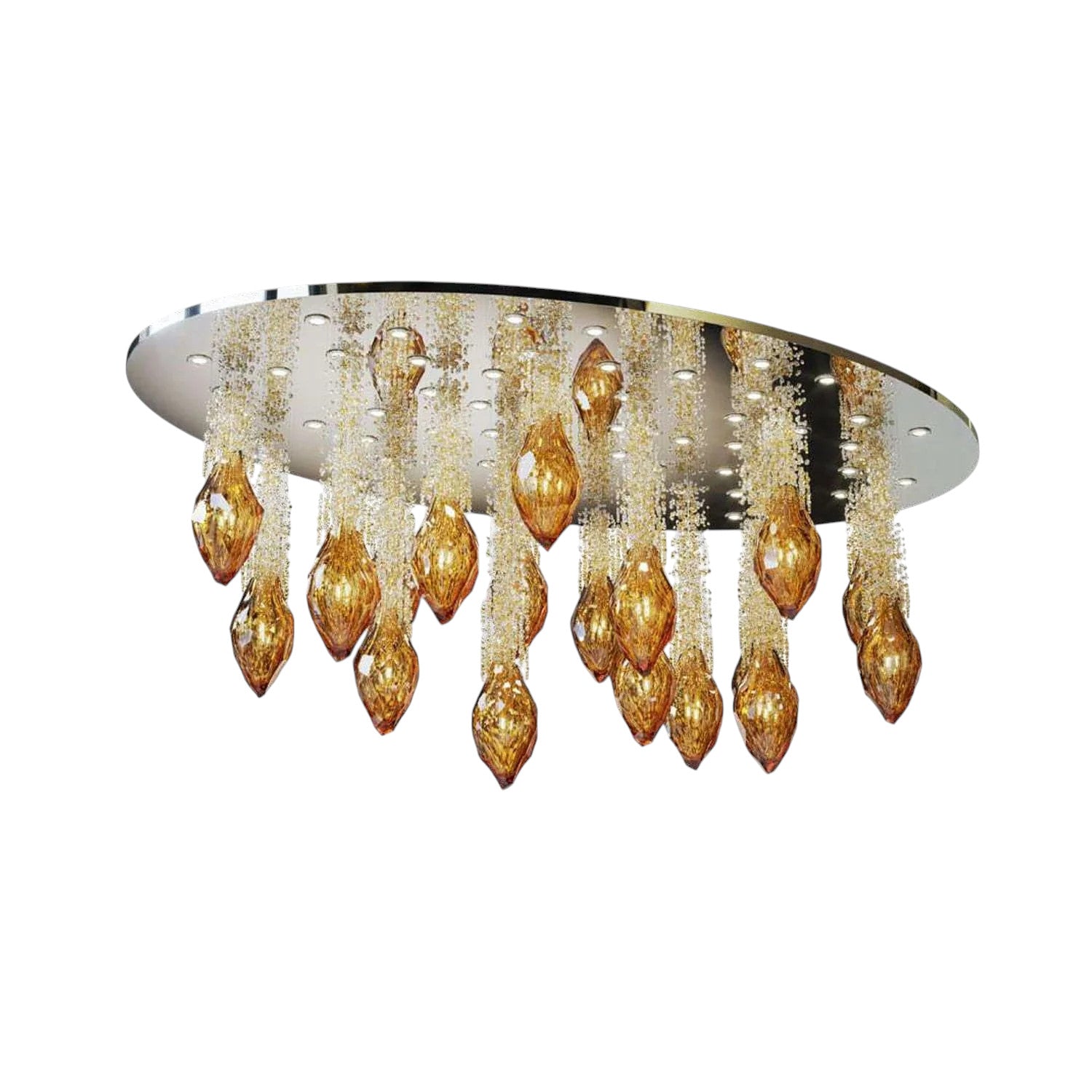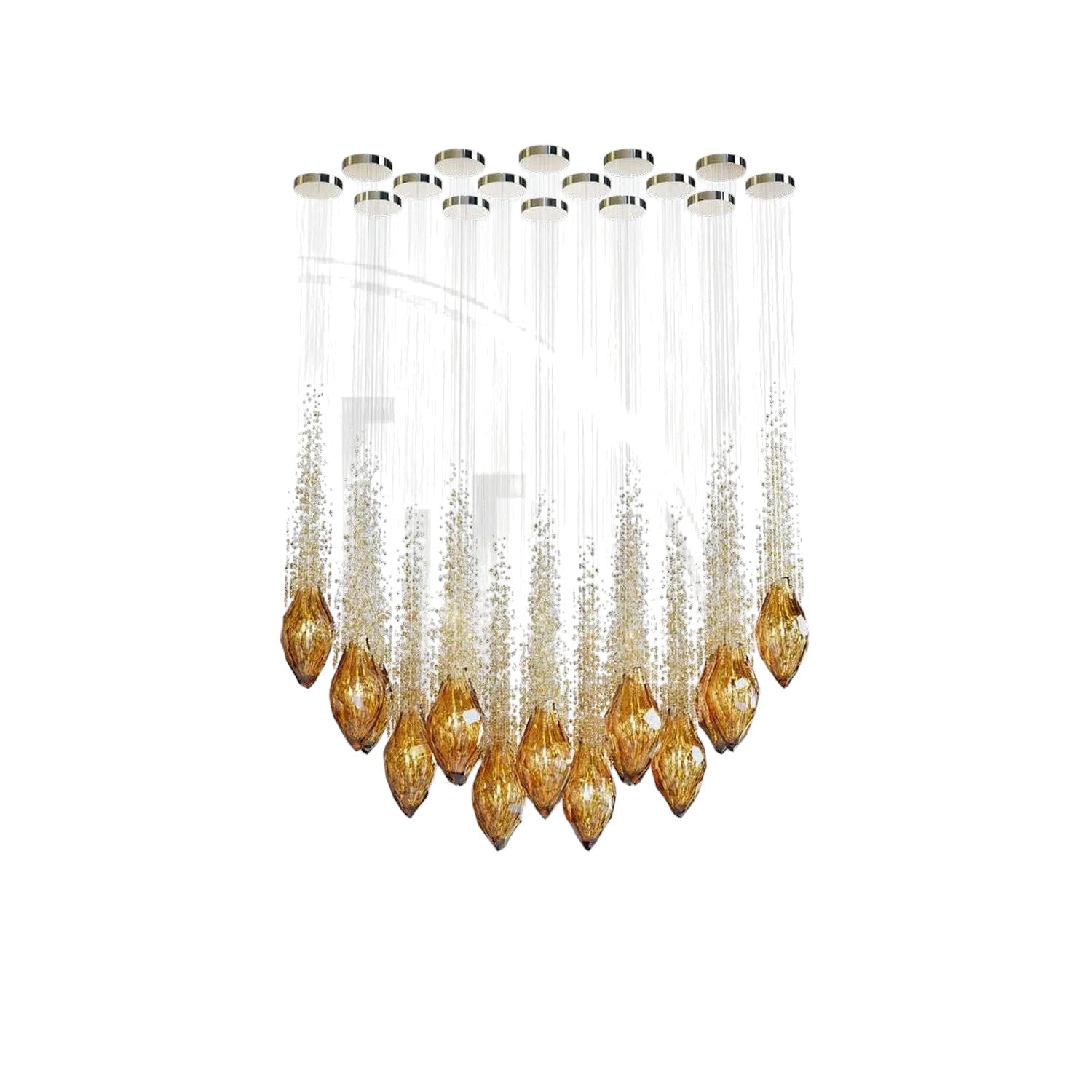 Add a touch of grandeur to your interiors with the Luminara Radiance Chandelier, designed to be the ultimate statement piece in any modern setting. Its sleek black finish creates a bold contrast, enhancing the atmosphere with depth and elegance. Crafted from premium glass and crystals, the amber-toned pendants beautifully diffuse light, bringing warmth and sophistication to your space. Powered by efficient LED lighting, this chandelier is perfect for duplex staircases, mezzanine levels, and high-ceiling interiors. Each piece is carefully made to order, with a production timeline of 20–25 days. Please note, installation is not included in the cost but can be arranged at an additional charge.