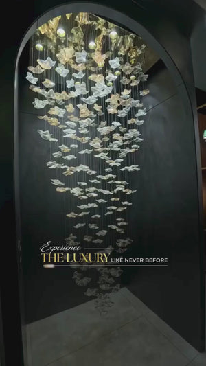 Vendor:Eliante By Jainsons LightsCustomised Golden Leaf Glass Chandelier with COB / GU10 Lighting – Double Height & Rectangular Designs