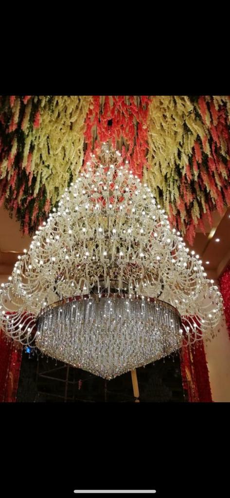 Ideal for premium hospitality and event spaces, this chandelier enhances the overall décor and adds a royal ambience to the venue. It works exceptionally well in large areas with high ceilings, making it suitable for wedding functions, receptions, and luxury celebrations.