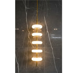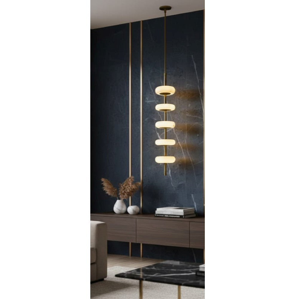 Description: The Rollo Ladder Pendant Light transforms illumination into a sculptural vertical statement. Composed of stacked, hand-carved marble discs made from authentic Indian white marble, each element glows with a soft, warm translucence when lit. Anchored to a minimalist, industrial-grade brass central spine, the composition creates a dramatic sense of height and rhythm that a single pendant cannot achieve. Designed for double-height foyers, grand staircases, and statement interiors, this pendant delivers architectural grandeur with refined material elegance.