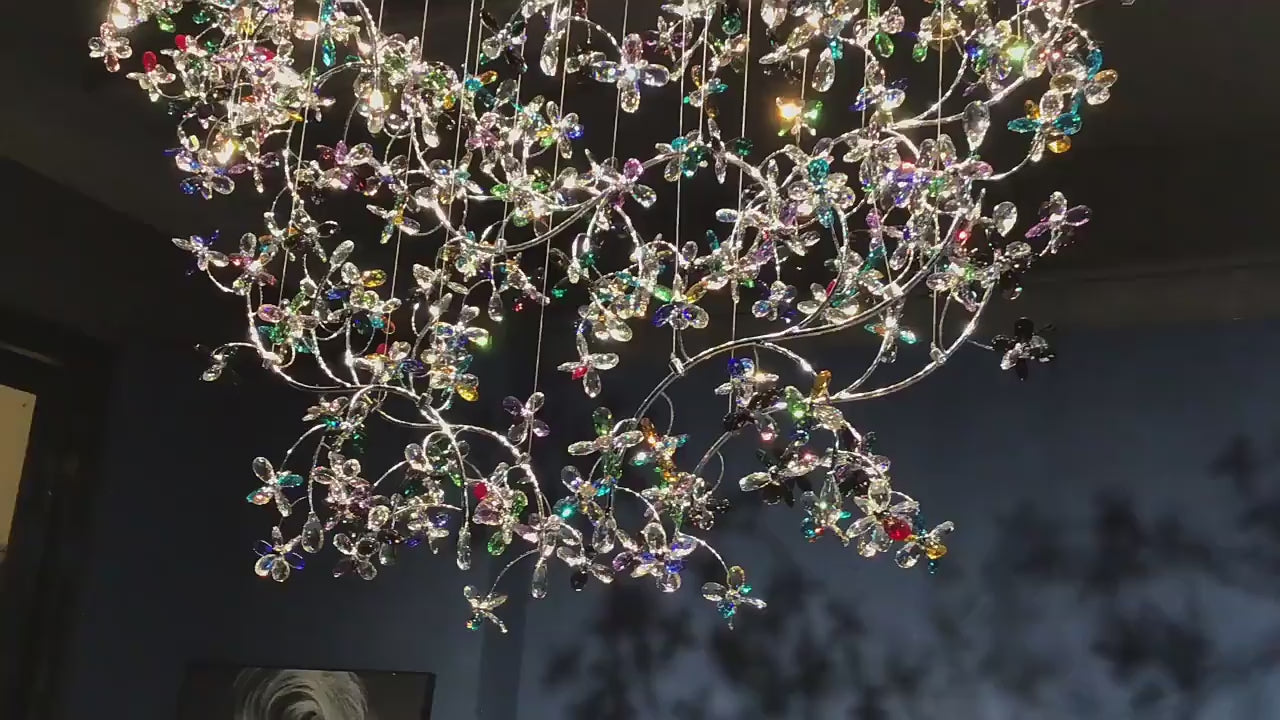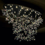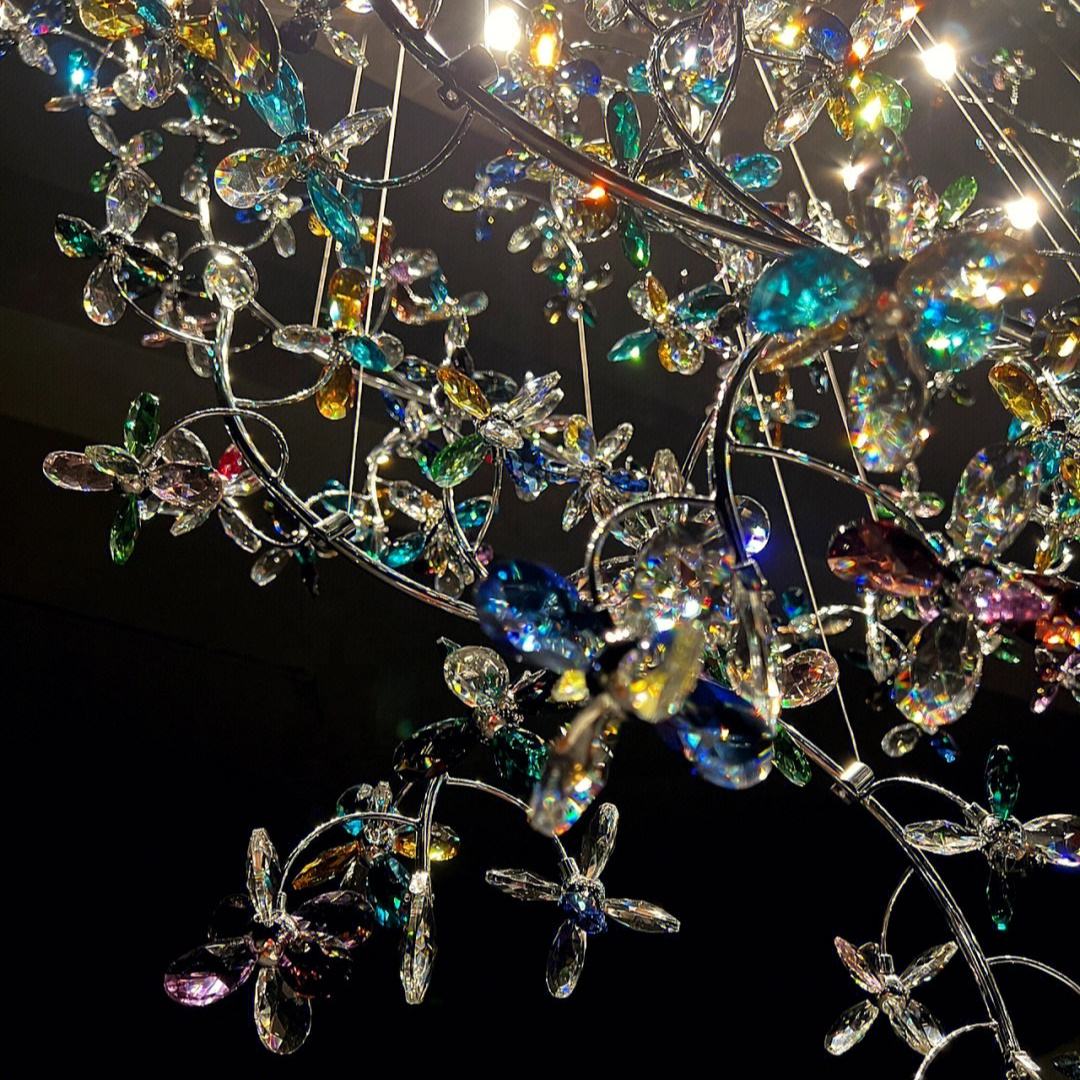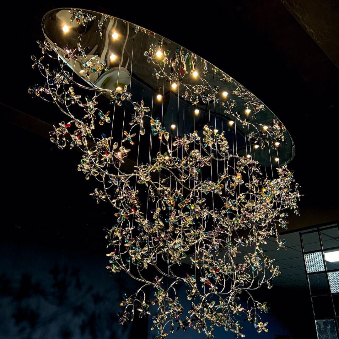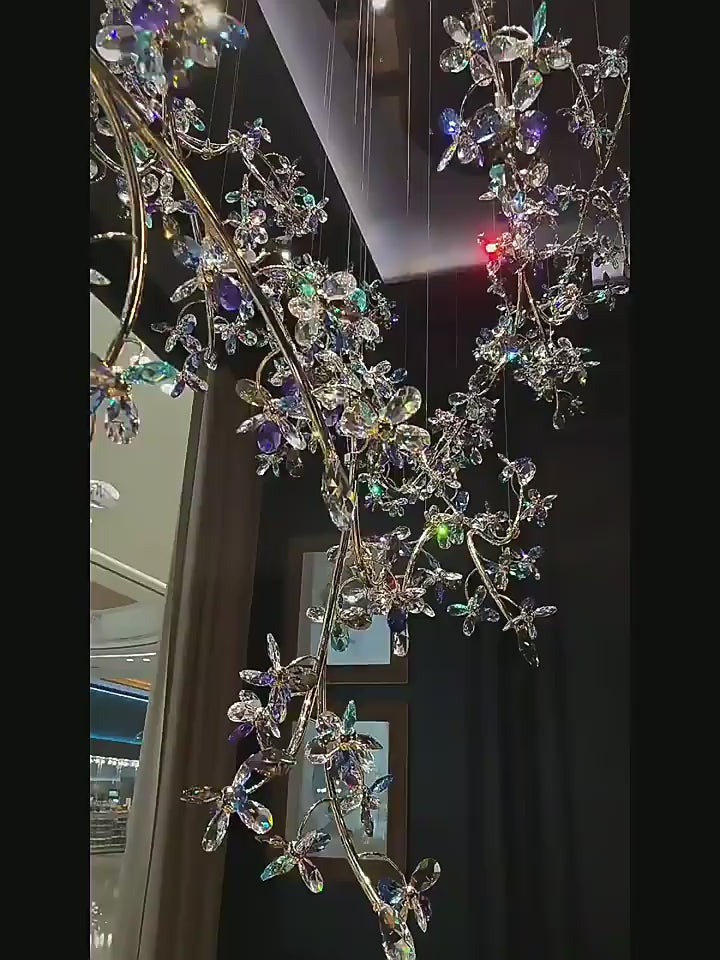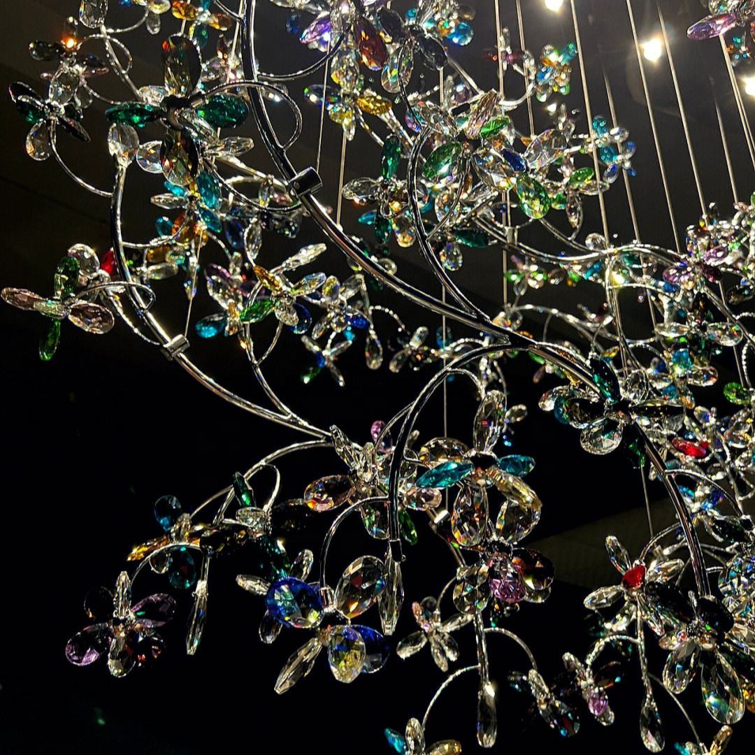 This chandelier blends artistic design and modern illumination, creating a stunning centerpiece for luxury villas, hotel lobbies, staircases, and living areas. The multi-layer arrangement of colorful crystal butterflies reflects radiant hues, evoking a sense of movement and tranquility.