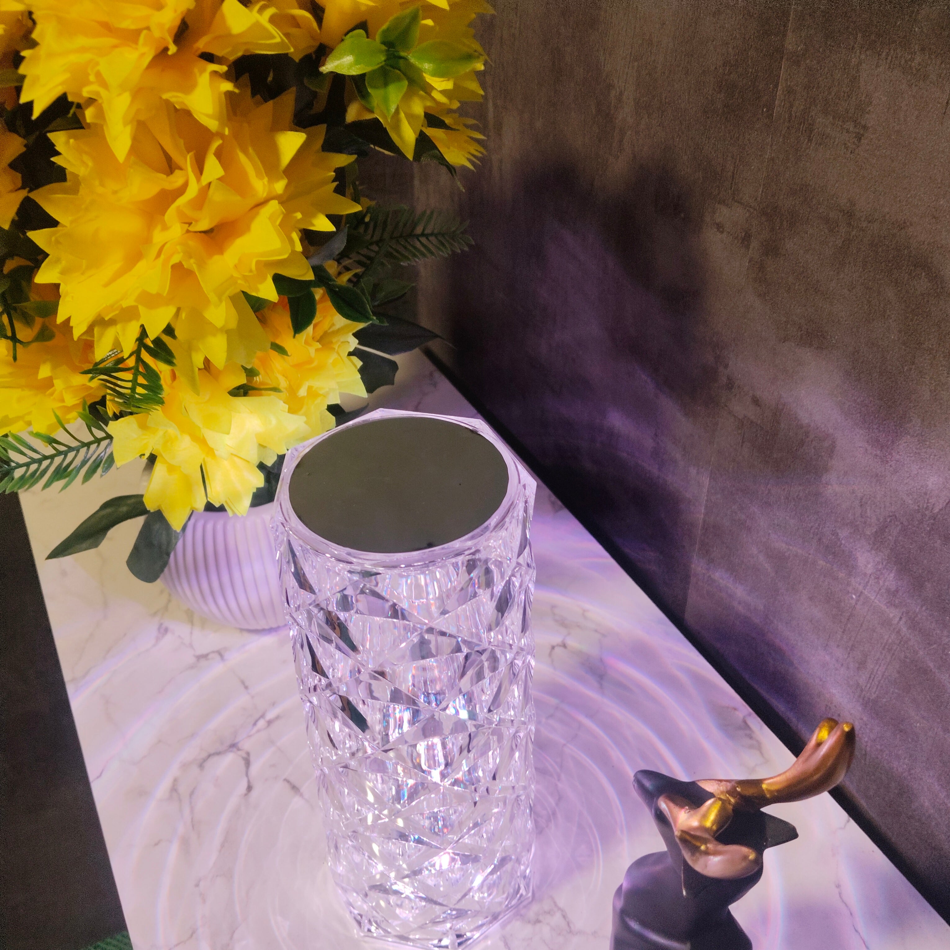 Designed with a beautifully cut diamond-style crystal body, this rechargeable lamp reflects mesmerizing patterns of light that transform any room into a cozy, luxurious ambiance.