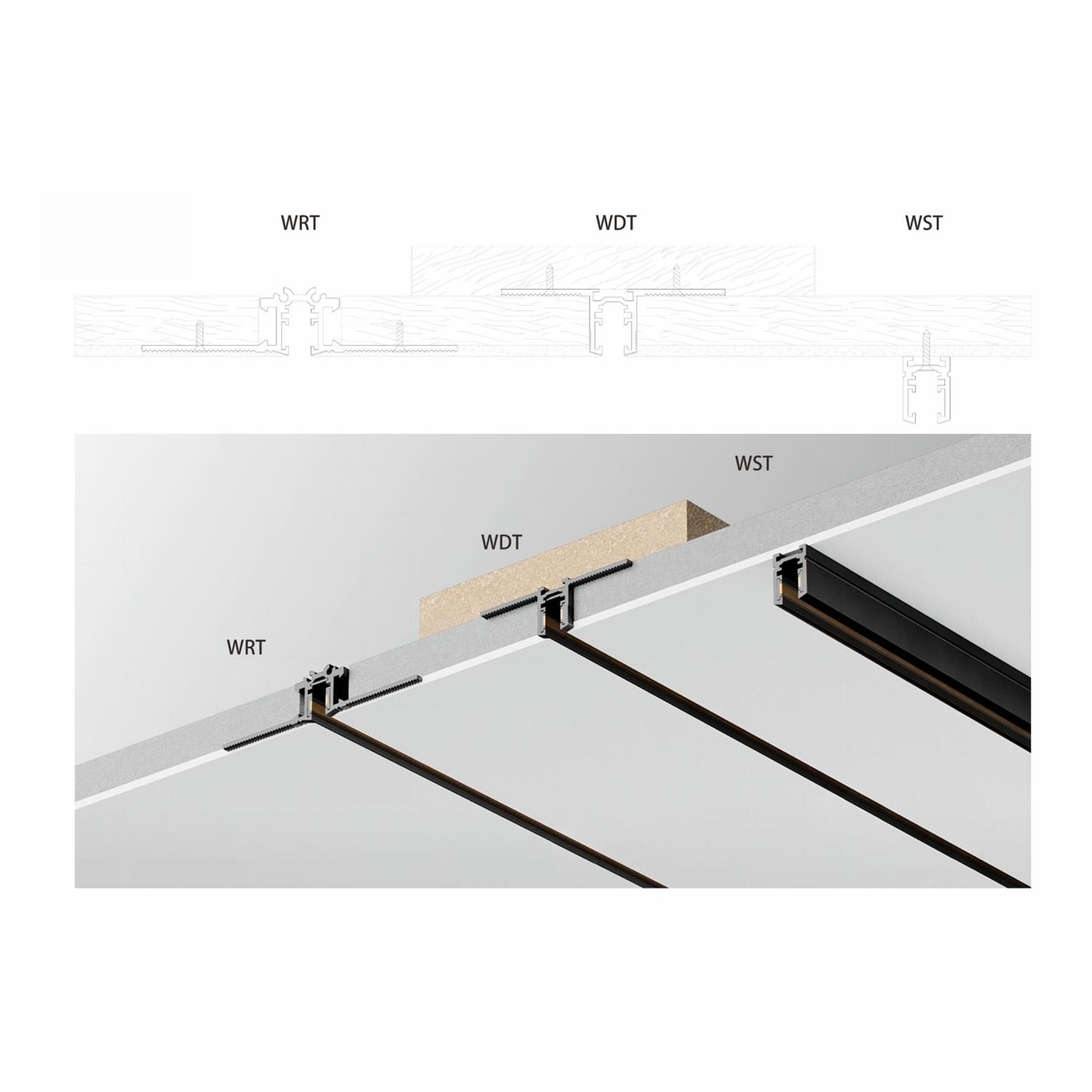 | Gypsum Recessed Track | 5mm (visible slot) × | 1m / 2m | Recessed in gypsum with minor finishing | Extruded aluminum |
