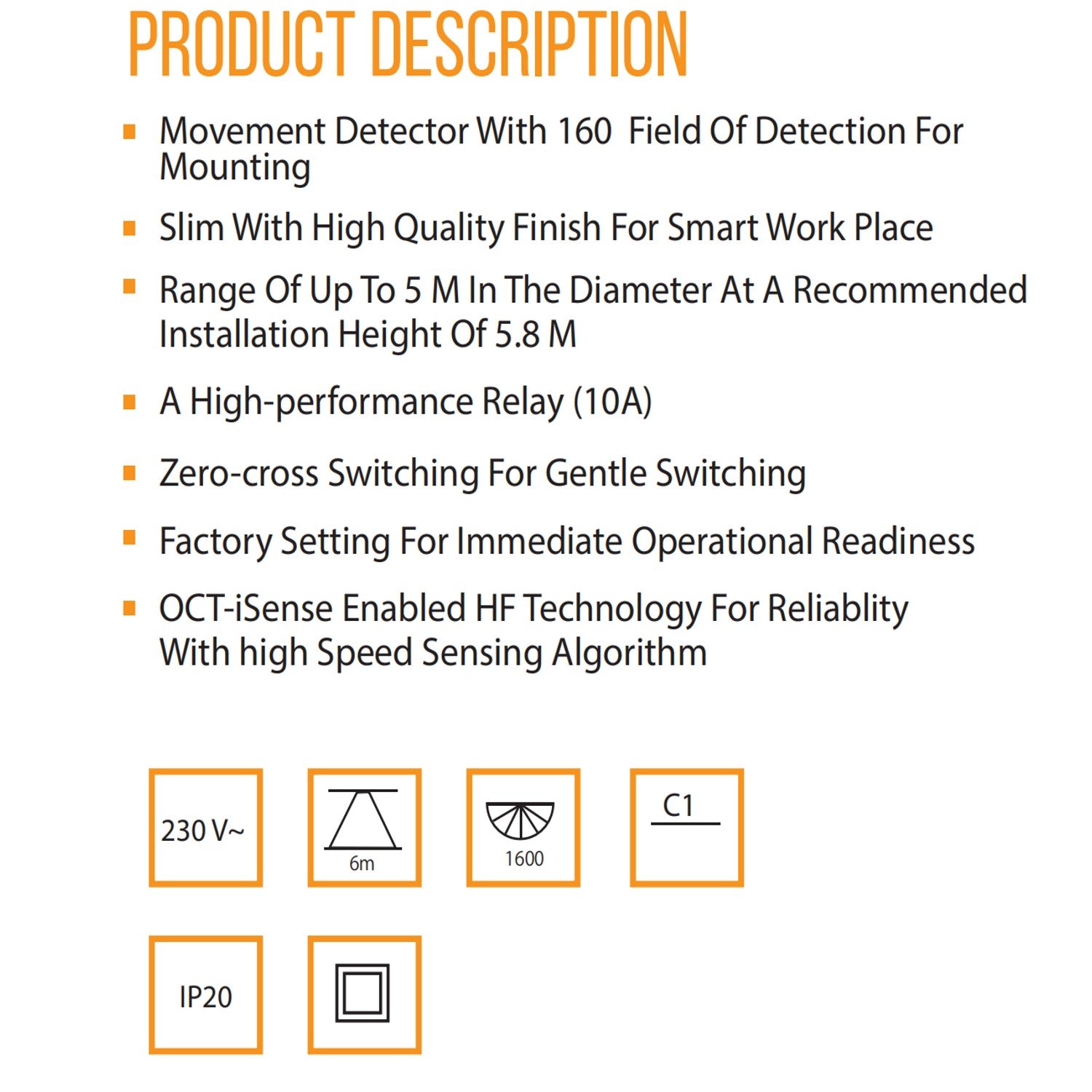 Description: Wall Mounted Movement Detector with 160° field of detection. Slim design with high-quality finish, ideal for smart workplaces. Covers up to 5m range at a recommended installation height of 5.8m. Equipped with a 10A high-performance relay, zero-cross switching, factory pre-set configuration, and OCT-iSense HF technology for reliable performance.
