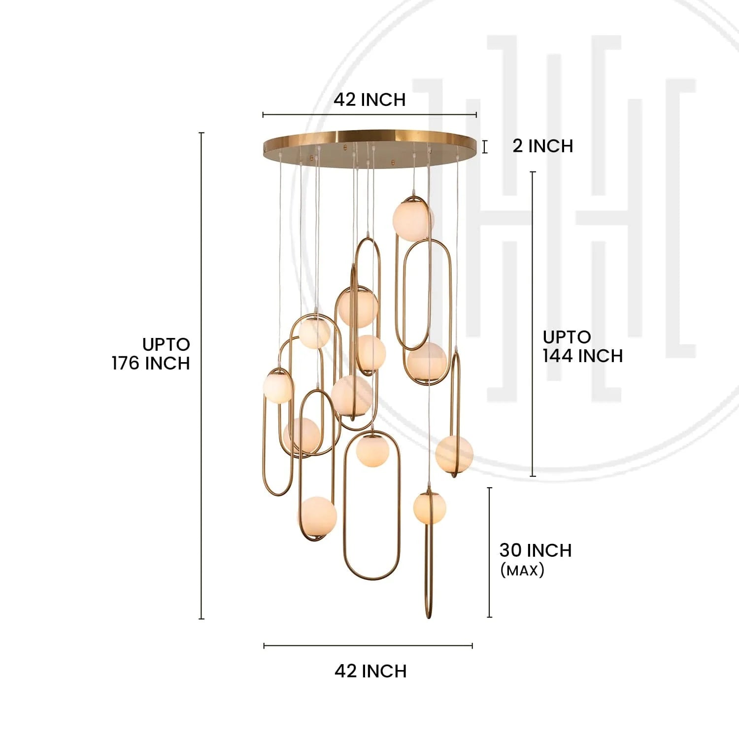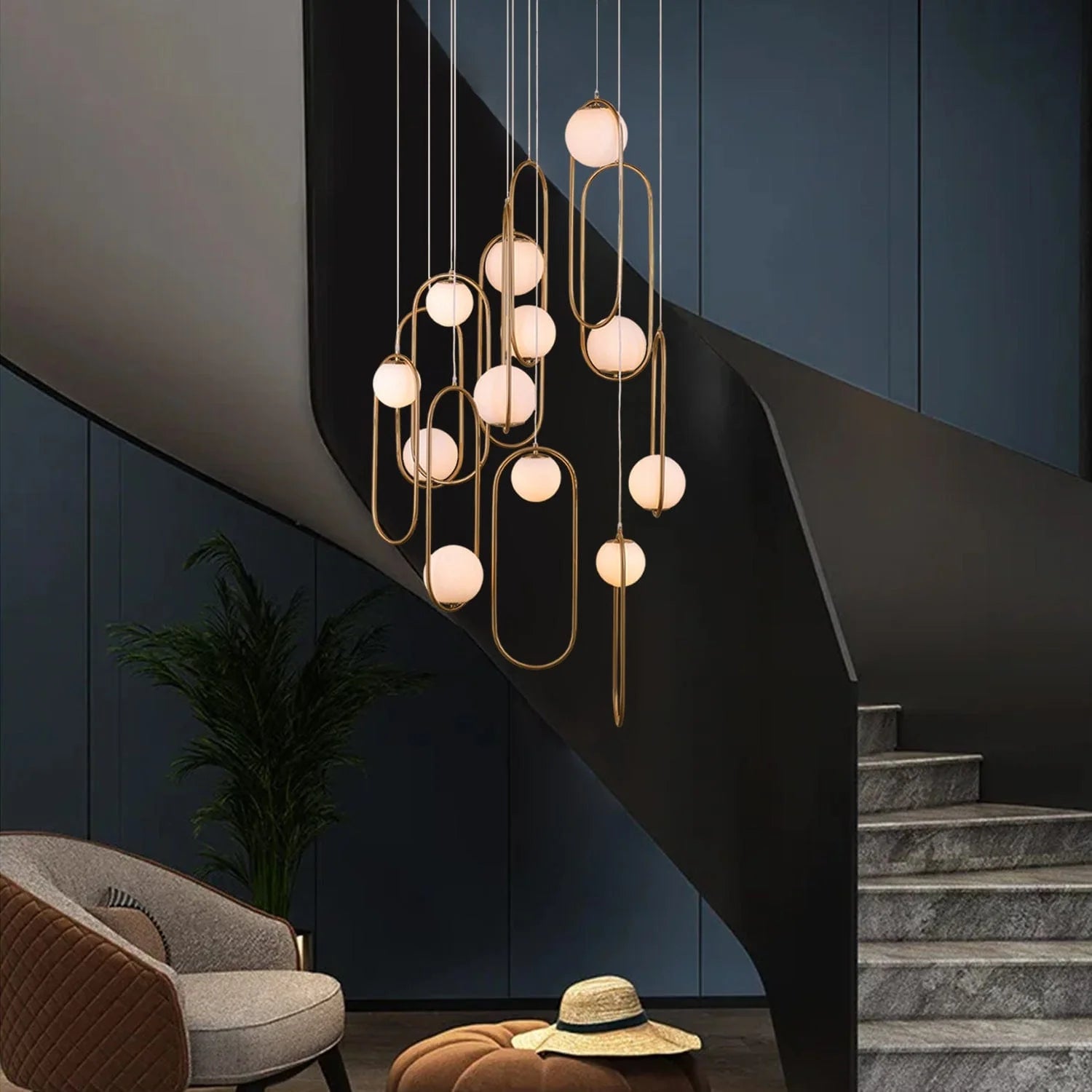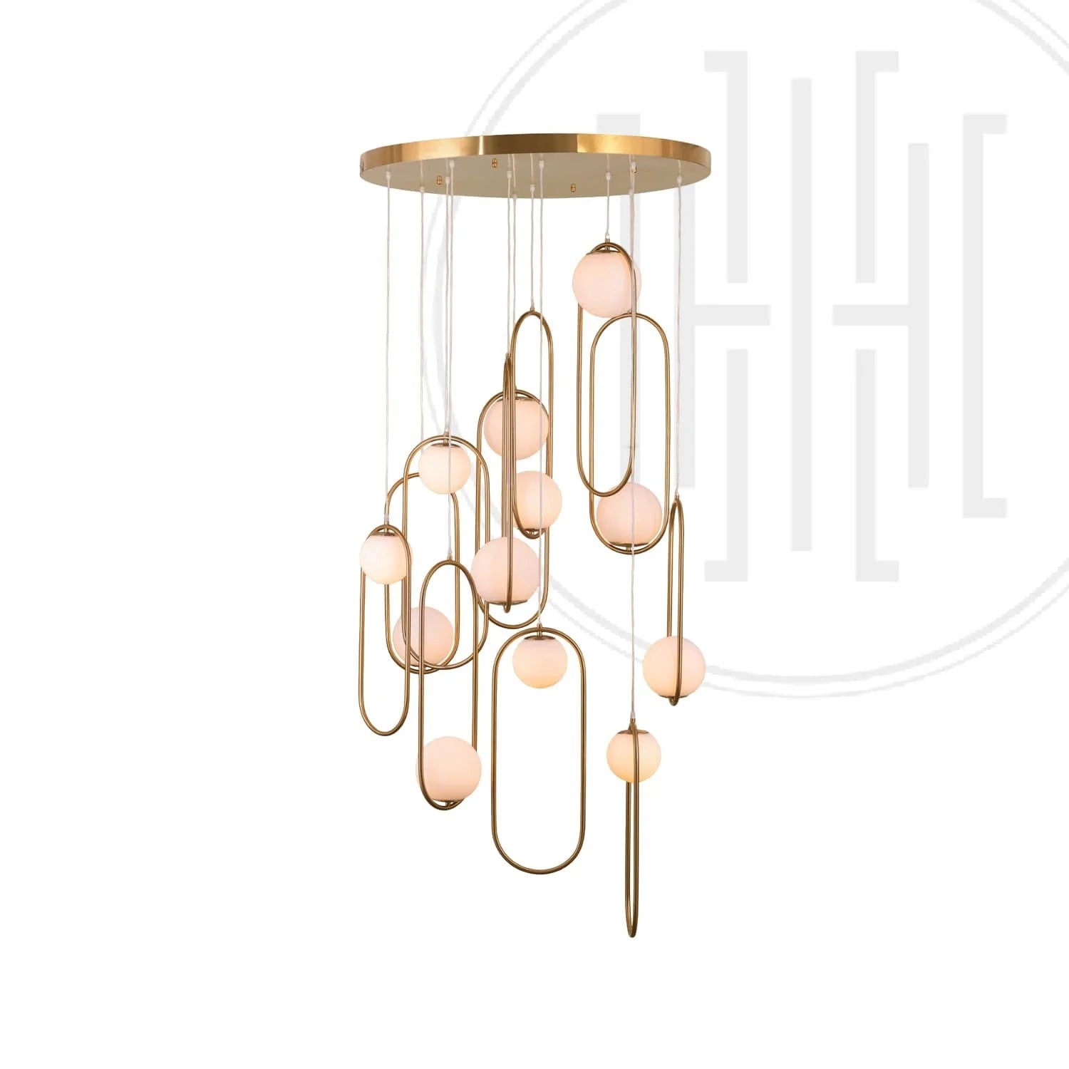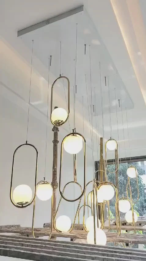 Discover the Aurelio Duplex Chandelier, featuring 12 frosted glass pendants with customizable orientation. Crafted from premium electroplated mild steel, this statement lighting piece enhances duplex staircases with elegance, grandeur, and timeless appeal. Proudly made in India.