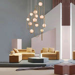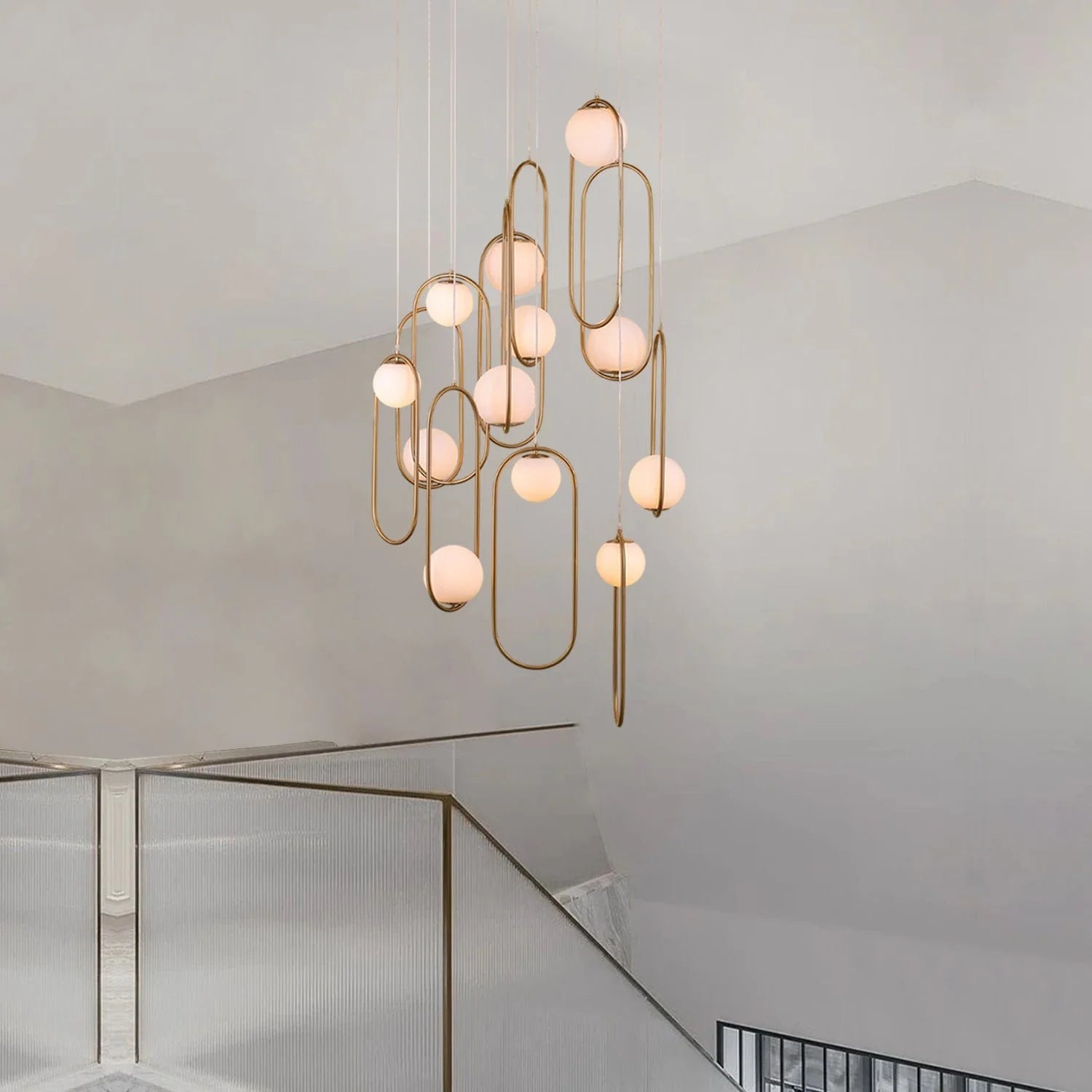The Aurelio Duplex Chandelier brings a modern touch of grandeur to duplex staircases and atrium spaces. Its 12 frosted glass pendants can be installed upright or inverted, allowing you to personalize the design and create a unique lighting effect.