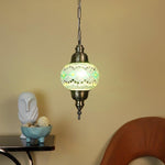 This hanging light is an elegant addition to any space. Its antique gold metal base adds a touch of luxury and its green white glass shade gives off a soft shaded glow. It's ideal for an entryway or above a dining table, especially if the light is on during dinner.